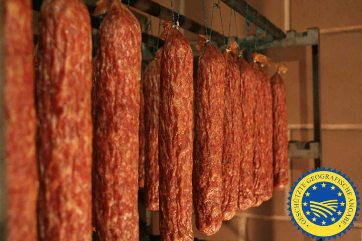 - G.g.A. Qualität: Diese Wurst trägt das geschützte geografische Angabe (g.g.A.) Siegel, was ihre Herkunft und Qualität garantiert.